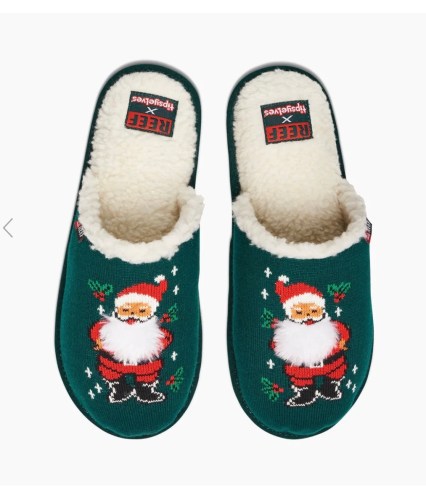 Reef X Tipsy Elves Holiday Slippers. Soft, cozy faux shearling lining, ugly sweater-esque top with festive funny message. $60 Shop Here: reef.com