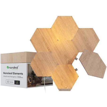 Nanoleaf Elements Hexagons 7 Piece Starter Kit. Create your own unique lighting designs. Enjoy the sophisticated wood grain veneer while off, or turn them on to illuminate your space with a dynamic glow. $199.99 Shop Here: nanoleaf.me/en-US