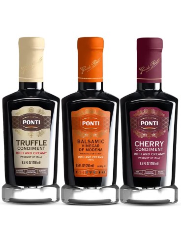 Ponti Rich & Creamy Trio. Set includes: Balsamic Vinegar, Cherry Condiment and Truffle Condiment. All 8.5oz. each. Every bottle provides a rich, intricate and harmonic balance with smooth tannins, full complexity and delicious taste. $42.99 Shop Here: amazon.com